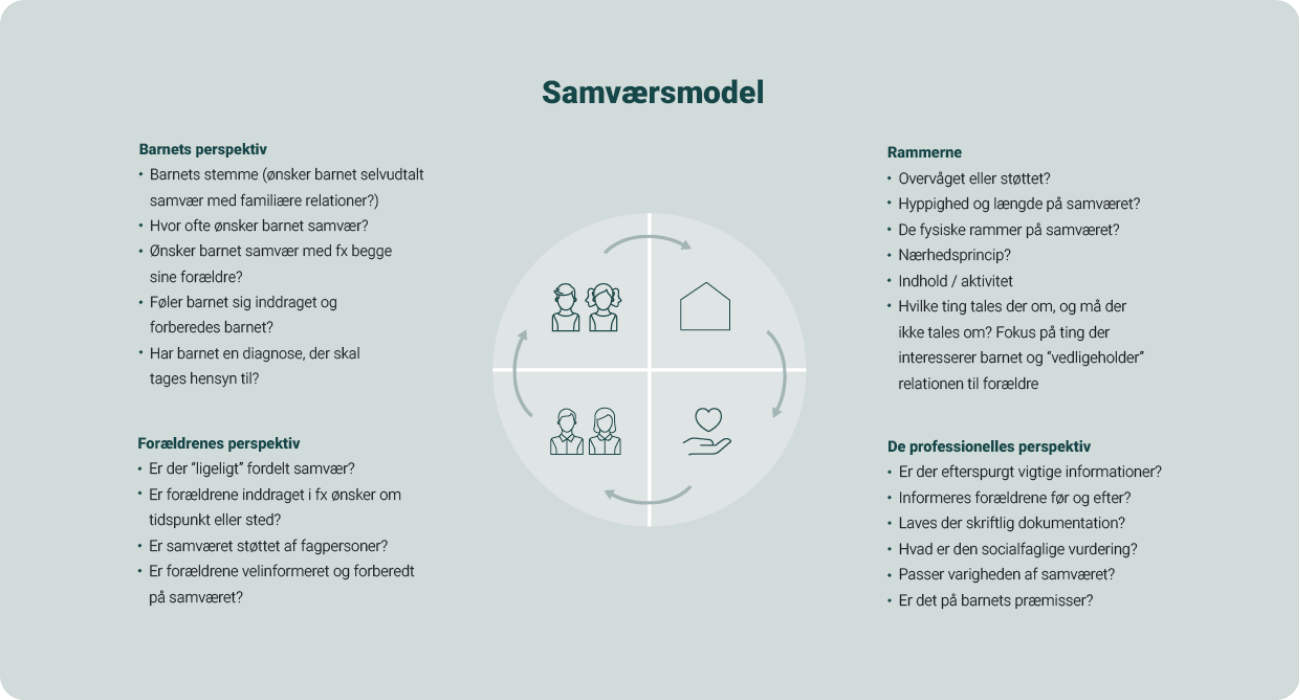 På den måde kan vi støtte og vejlede forældre og omsorgspersoner i at planlægge og skabe en god ramme for samværet, med barnet i centrum.